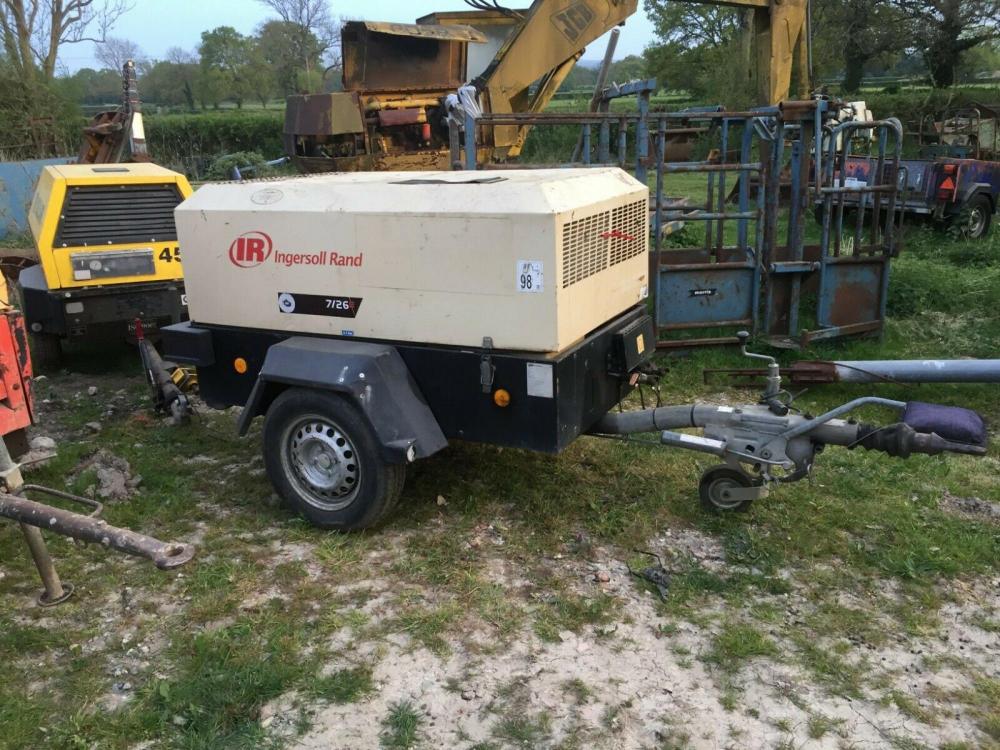 Ingersoll Rand 726E towed compressor – 2007 – 2380 recorded hours – starts easily – runs well – diesel engine – 2.5 cubic metres per minute – max pressure 125 lbs per sq inch – located close to Gatwick Airport – more detail please call 07771882766 – 01342842478 – call or tx – loading – delivery to most UK ports and destinations – many more items for sale – farm and plant – see other listings – we also buy items – price £2450 plus vat £2940